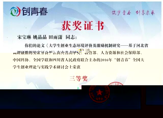 經濟管理系宋寶琳、田雨潇等老師所撰寫的論文《大學生創業生态環境評價及激勵機制研究——基于河北省調研數據的實證分析》榮獲全國三等獎。該項成果填補了我系在“創青春”創業大賽理論與實踐研究上的空白。